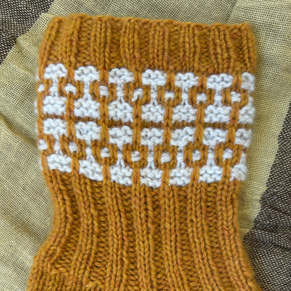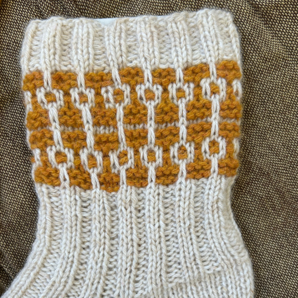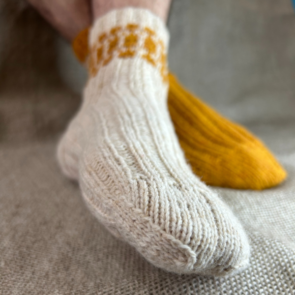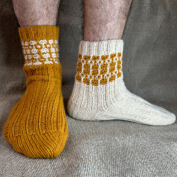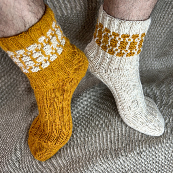 Las medias se tejen de la caña a la puntera, en dos versiones simétricas (espejo), intercambiando los colores principal y secundario. El diseño incluye una estructura anatómica: puntera cerrada con Kitchener Stitch, talón de solapa con gusset inferior y un cuerpo en punto elástico 2x2 para mayor confort y ajuste.