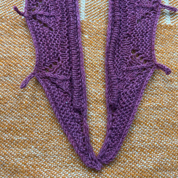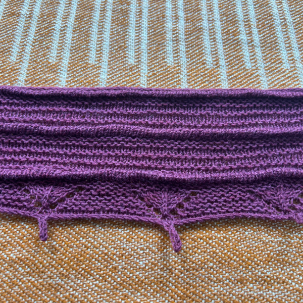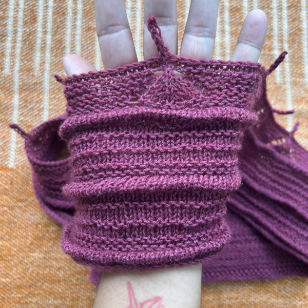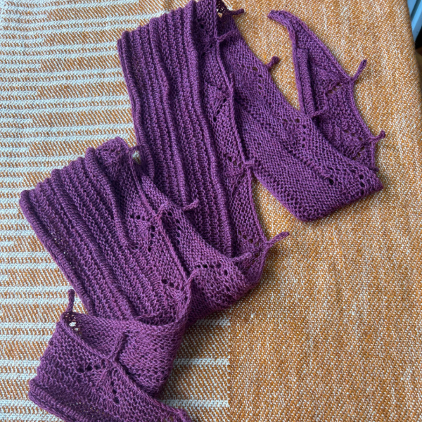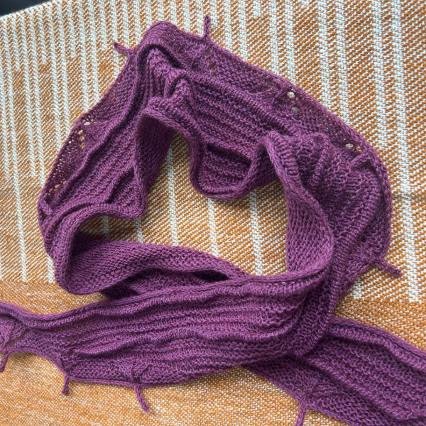 El diseño se construye de manera longitudinal, comenzando con un montaje y base en i-cord, que aporta una terminación prolija y estructurada en todo el contorno. A lo largo del scarf se desarrollan distintas secciones de relieves y texturas, combinando punto derecho, punto revés y jersey, trabajadas mediante vueltas cortas para generar profundidad y movimiento visual.