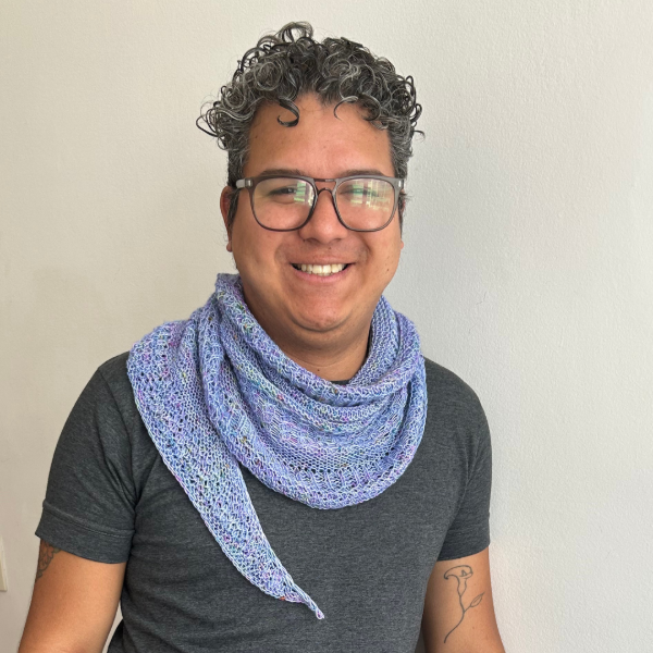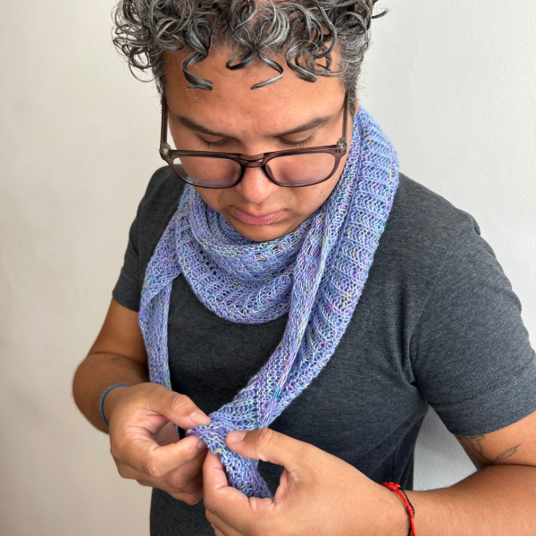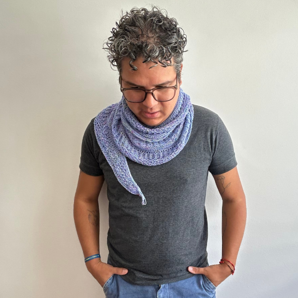 El Shawl Silvia es un diseño muy especial inspirado en una de mis alumnas, Silvia, y tejido con una madeja de lana superwash Rey Príncipe de Chile. Combina un delicado calado, brioche en vueltas cortas, trencitas y un toque sincopado, creando un tejido dinámico, entretenido y lleno de detalles únicos.